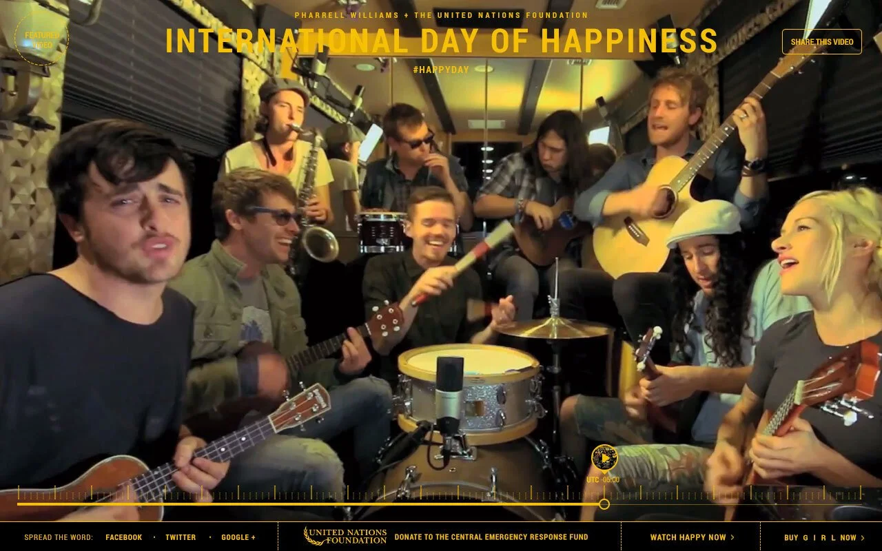 Immediately after it was released with the first ever 24 hour music video, thousands of fans around the globe were inspired to share their own dance and cover interpretations of the song. As a result, our team leveraged the song’s virality and partnered with the United Nations to further drive UGC and promote the organization’s newly unveiled International Day of Happiness that occurs every March 20th.